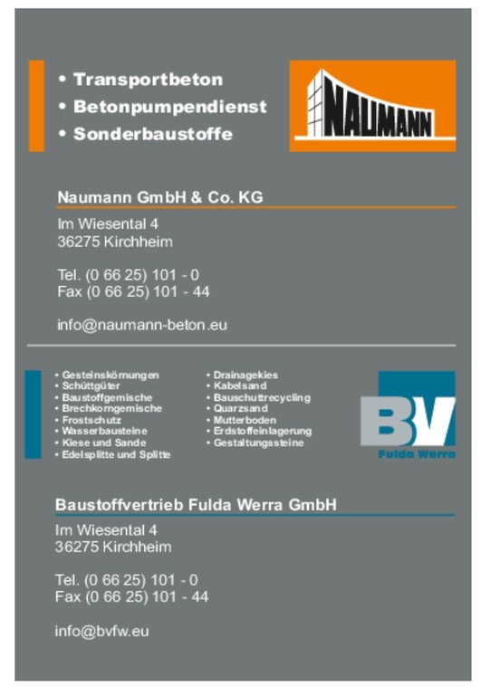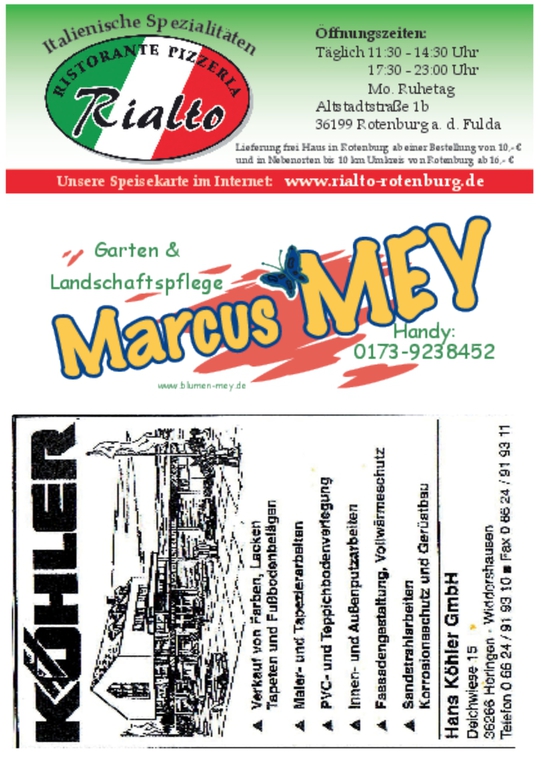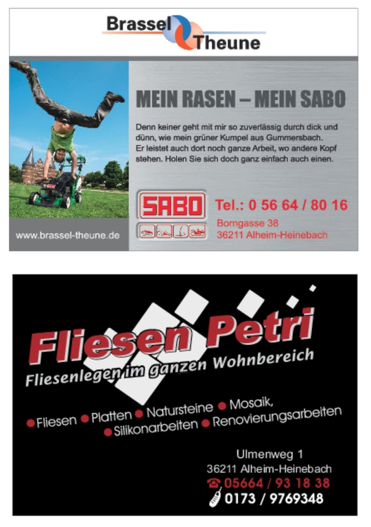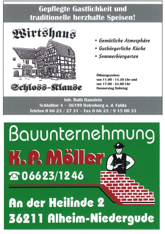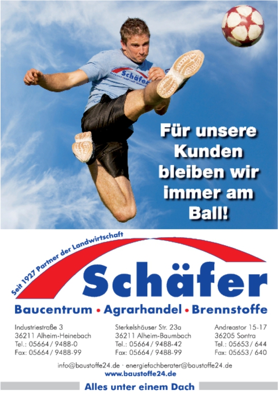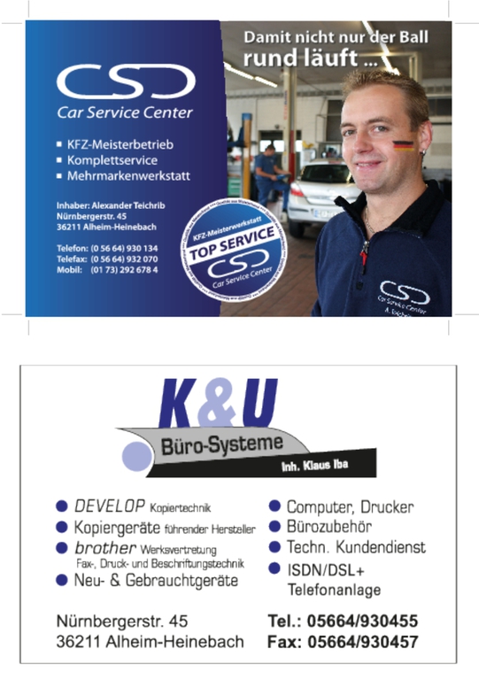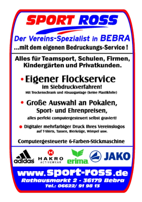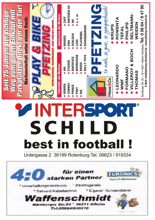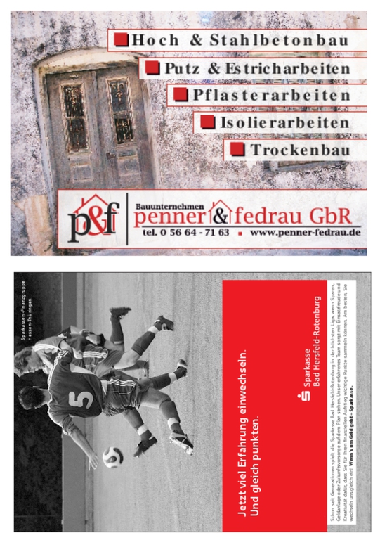 BauSpezi Schäfer - Krug Internationale Spedition - Bankverein Bebra eG - Kirchner Solar Group - Fritz Franke - Gaststätte "Am Gänsemart" - Naumann - B3-Folientechnik - Firma Pfetzing - Sparkasse Bad Hersfeld/Rotenburg - Baumit Bayosan - Alheimer Apotheke - Per-Spektive - HKW - Brauerei Hütt - Lackiererei Klaus Sukkau - Friseurteam Weiz - Kosel - Dachdecker Th. Jäger - E.ON - Martin Haustechnik - Landhaus Licherode - Das Hundelädchen